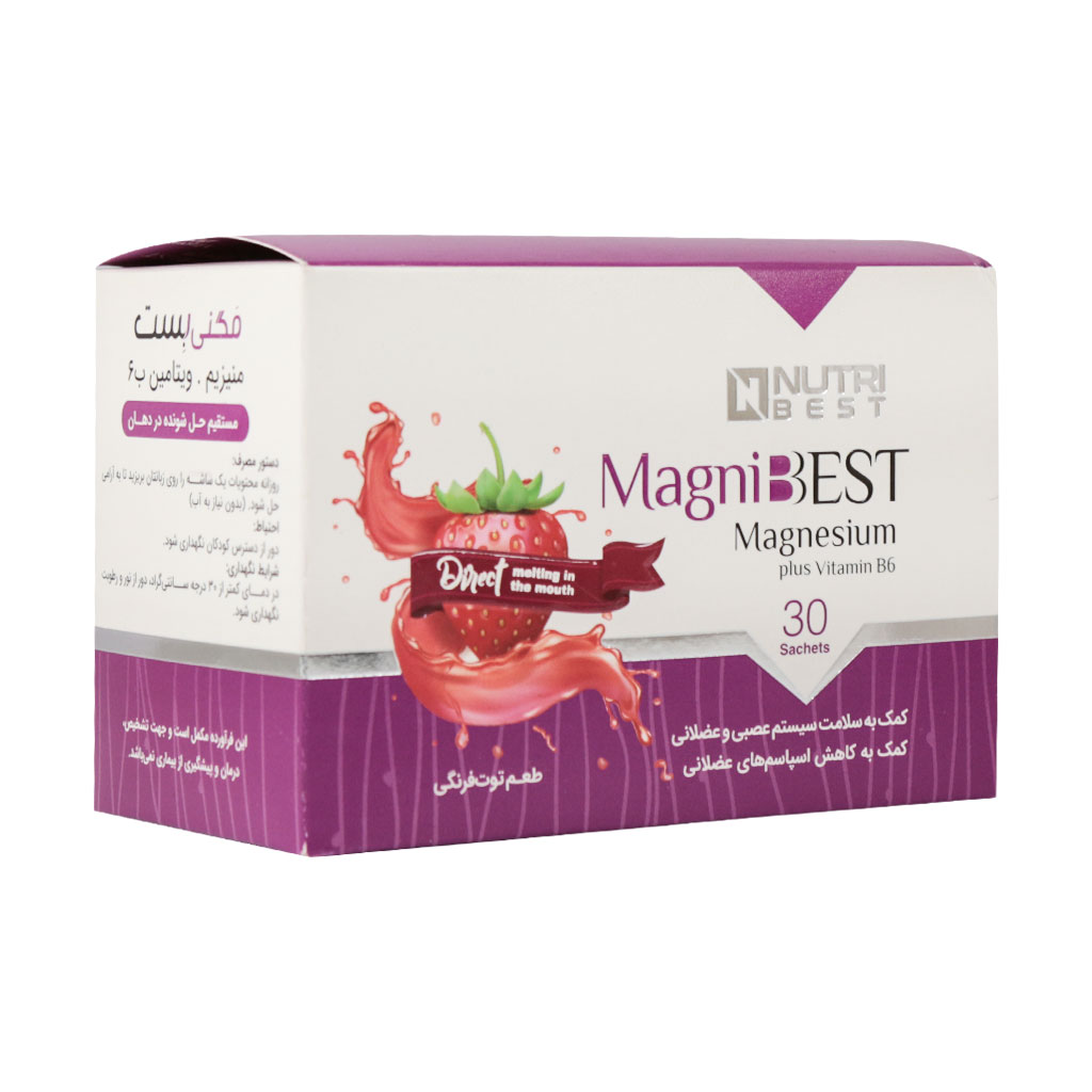 حاوی پودر منیزیوم و ب 6 کمک به سلامت سیستم عصبی و عضلانی و کاهش اسپاسم عضلانی با طعم توت فرنگی